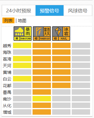 截至8时40分,广州越秀、海珠、荔湾、天河、黄埔、白云、花都均发布冰雹橙色预警。